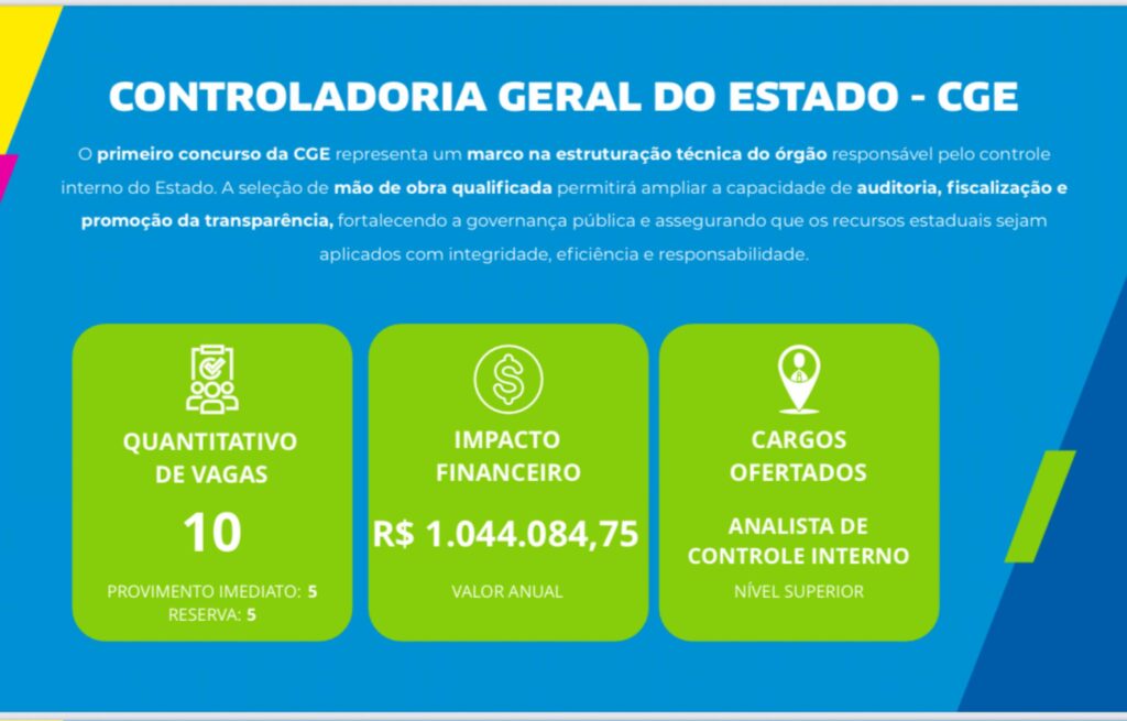 Para a Controladoria, serão disponibilizadas 10 vagas para o cargo de Analista de Controle Interno nível superior, sendo cinco para provimento imediato e cinco destinadas a cadastro de reserva.